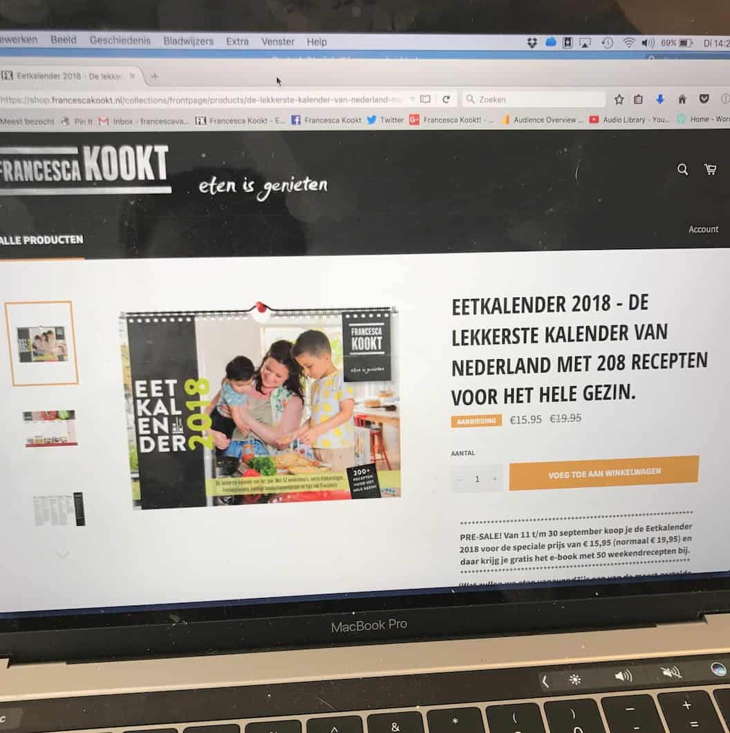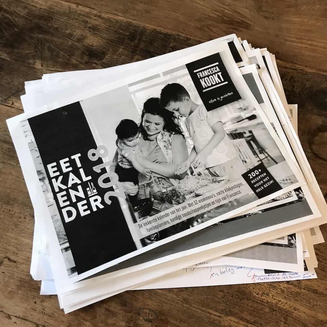 Vooral omdat de lol van het eerste jaar om de kalender zelf te maken, met alle onzekerheden, nachtelijke uurtjes, maar ook het gevoel van ‘dit doen we helemaal zelf’ weg was. En dat wilde ik weer terug! Het gaat namelijk niet primair om het geld. Natuurlijk wil je er niet op verliezen, maar ik wil vooral ook trots kunnen zijn op wat we bereiken met Francesca Kookt. Ik wil trots zijn als de Eetkalender 2018 straks in jullie keukens hangt, omdat over iedere millimeter is nagedacht en alles wat erin staat met heel veel liefde voor eten en de gebruikers (want die dagelijkse vraag van ‘wat gaan we nou weer eten’ ken ik maar al te goed) is gemaakt.