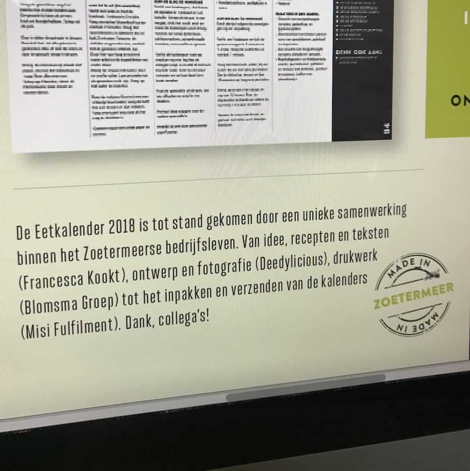 Hoe zit het dan met de Eetkalender en waarom heb ik besloten om die zelf uit te geven? Eigenlijk is er niet zoveel veranderd, want toen ik samen met Deedylicious de Eetkalender bedacht in 2016 hebben we de eerste editie ook zelf uitgegeven. Dat ging toen nog met heel veel vallen en opstaan, want we hadden destijds nog niet de kennis die we nu hebben. Zo heb ik nachtenlang moeten ploeteren om teksten te redigeren, controleren en boodschappenlijstjes te maken omdat ik geen flauw benul had van de hoeveelheid tijd die daarin ging zitten. Dat weet ik nu wel 😉