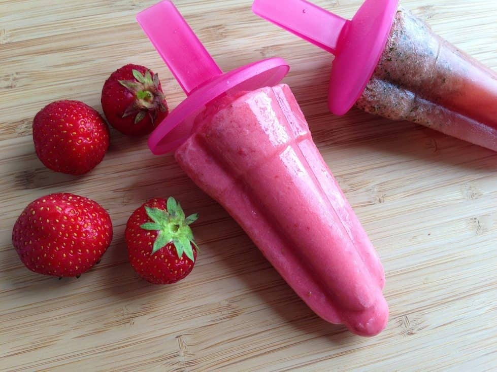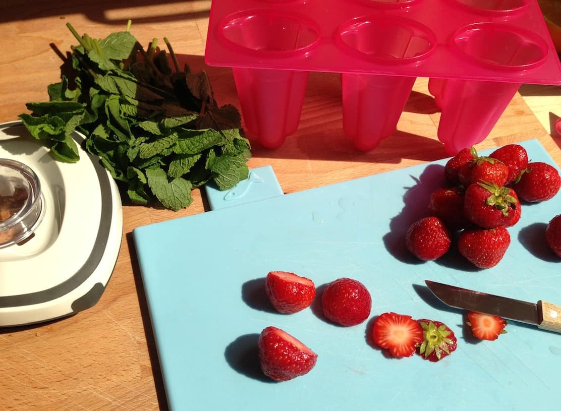 Voor de aardbeien ijsjes pureer je de aardbeien met de kokosmelk en agavesiroop. Schenk dit mengsel in de popsicle vormpjes en vries ze in.