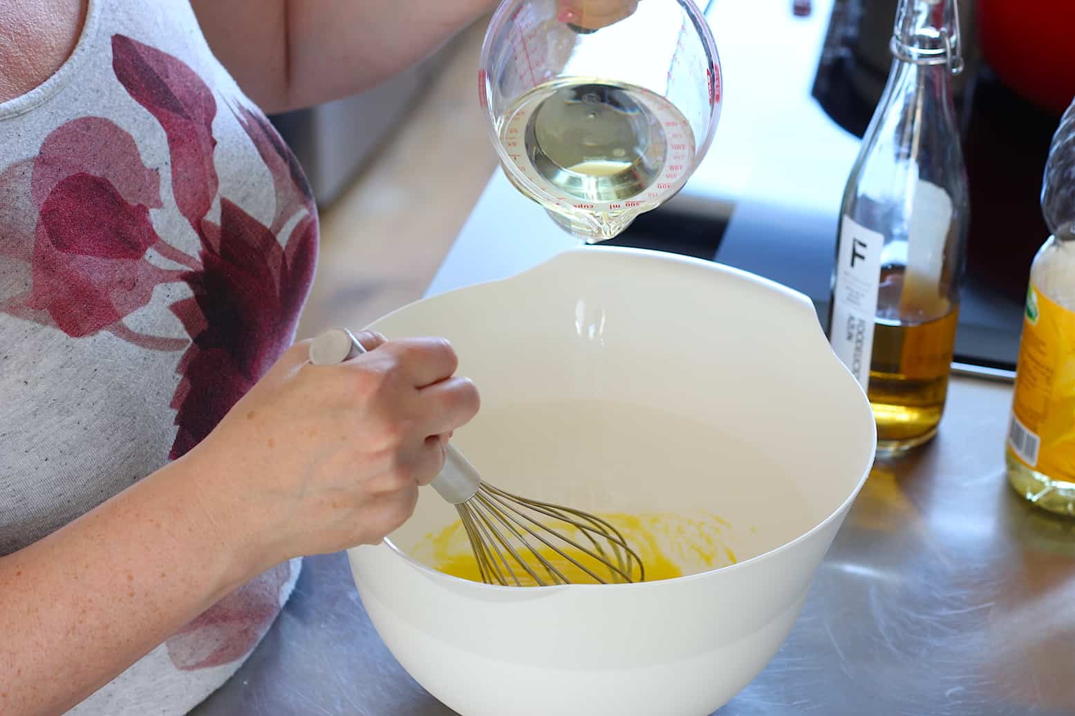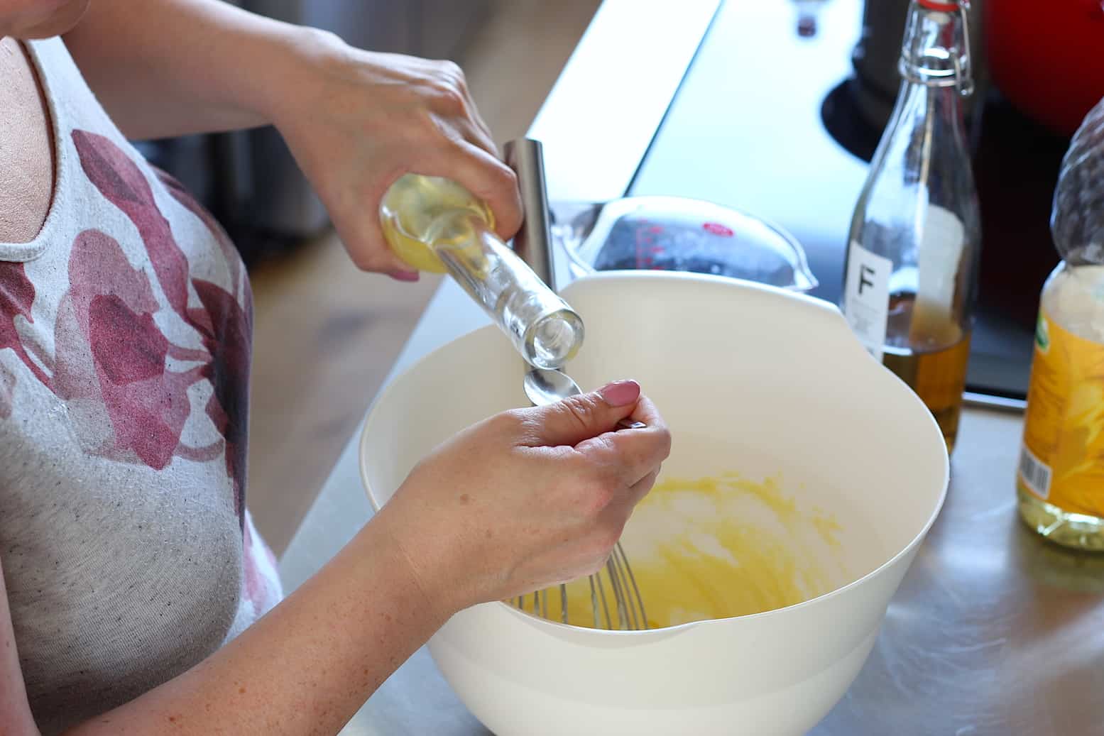 - Giet beetje voor beetje de olie erbij terwijl je blijft kloppen/mixen. Telkens als het zich bindt kun je weer wat olie toevoegen.