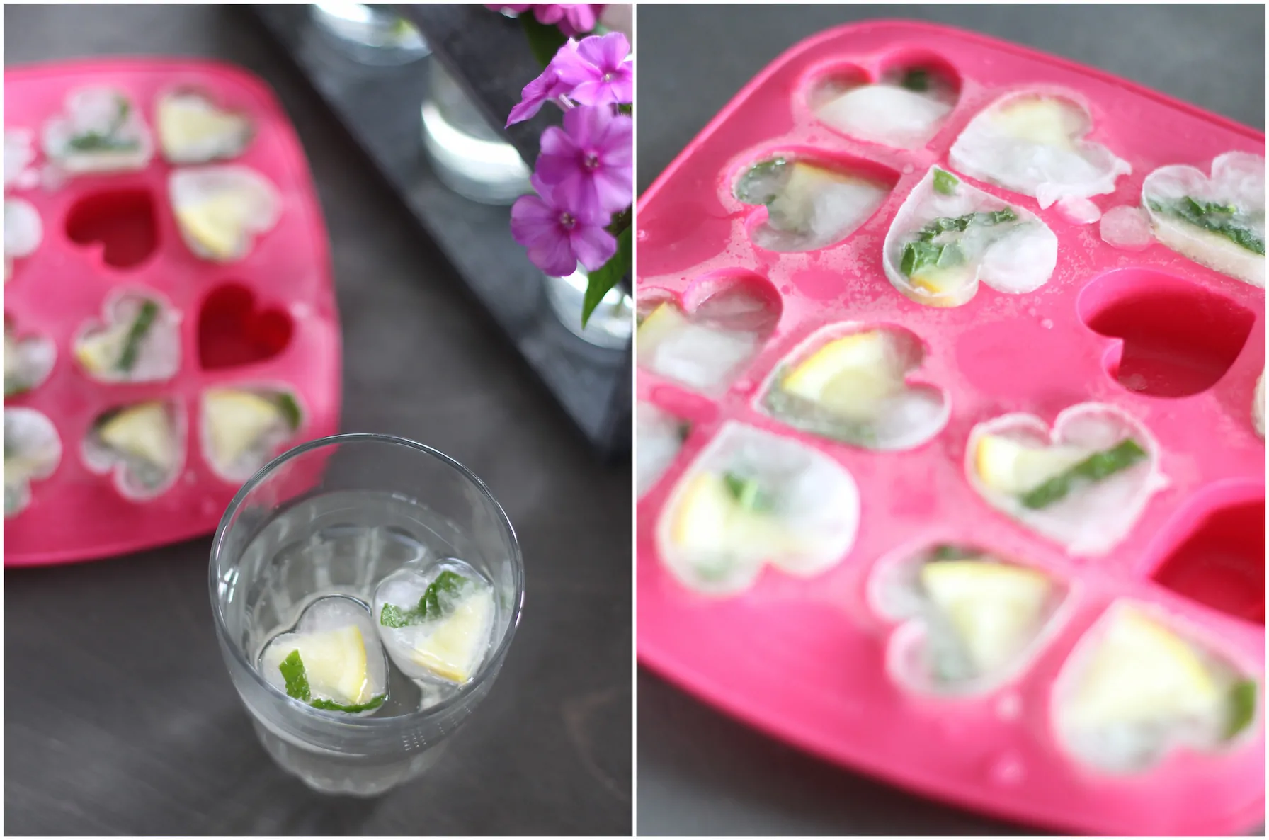 Vul een ijsblokjeshouder met partjes citroen en reepjes munt en vul deze met citroenlimonade (bijvoorbeeld Spa Citron). Zet in de vriezer en zo heb je altijd feestelijke en verfrissende ijsblokjes op voorraad waarmee je een glas water op smaak kunt brengen.