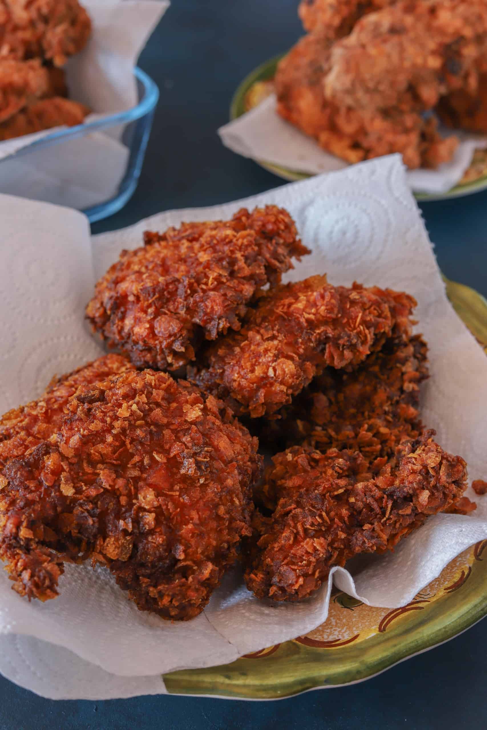 - Terwijl de kip in het vet ligt, coat je weer een volgende batch tot alle kip op is.