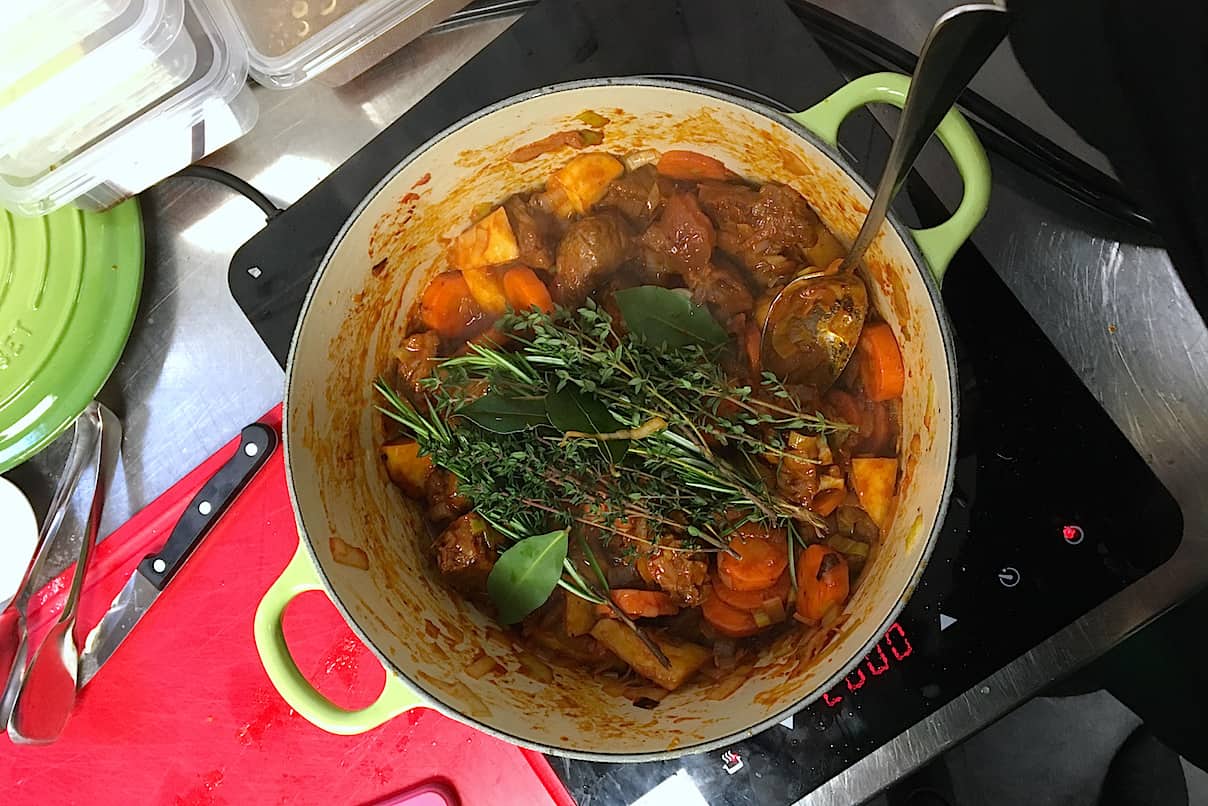 Om de stoofpot hoog op smaak te brengen, raad Andrès aan om altijd een bijpassend zuur toe te voegen. Bijvoorbeeld (balsamico)azijn, bier, witte of rode wijn, citroen of limoen. Je kunt ook kiezen voor tomatenpuree of een combinatie. Belangrijk is dat je het zuur niet te snel in de pan giet, want dan trekt het vlees samen en heb je kans op taai vlees. Daarna voeg je nog meer vloeistof toe voor extra smaak en variatie. In de vorm van bouillon, kokosmelk of jus d’orange. Het bouquet wat je eerder hebt toegevoegd, haal je na het toevoegen van de vloeistoffen uit de pan.