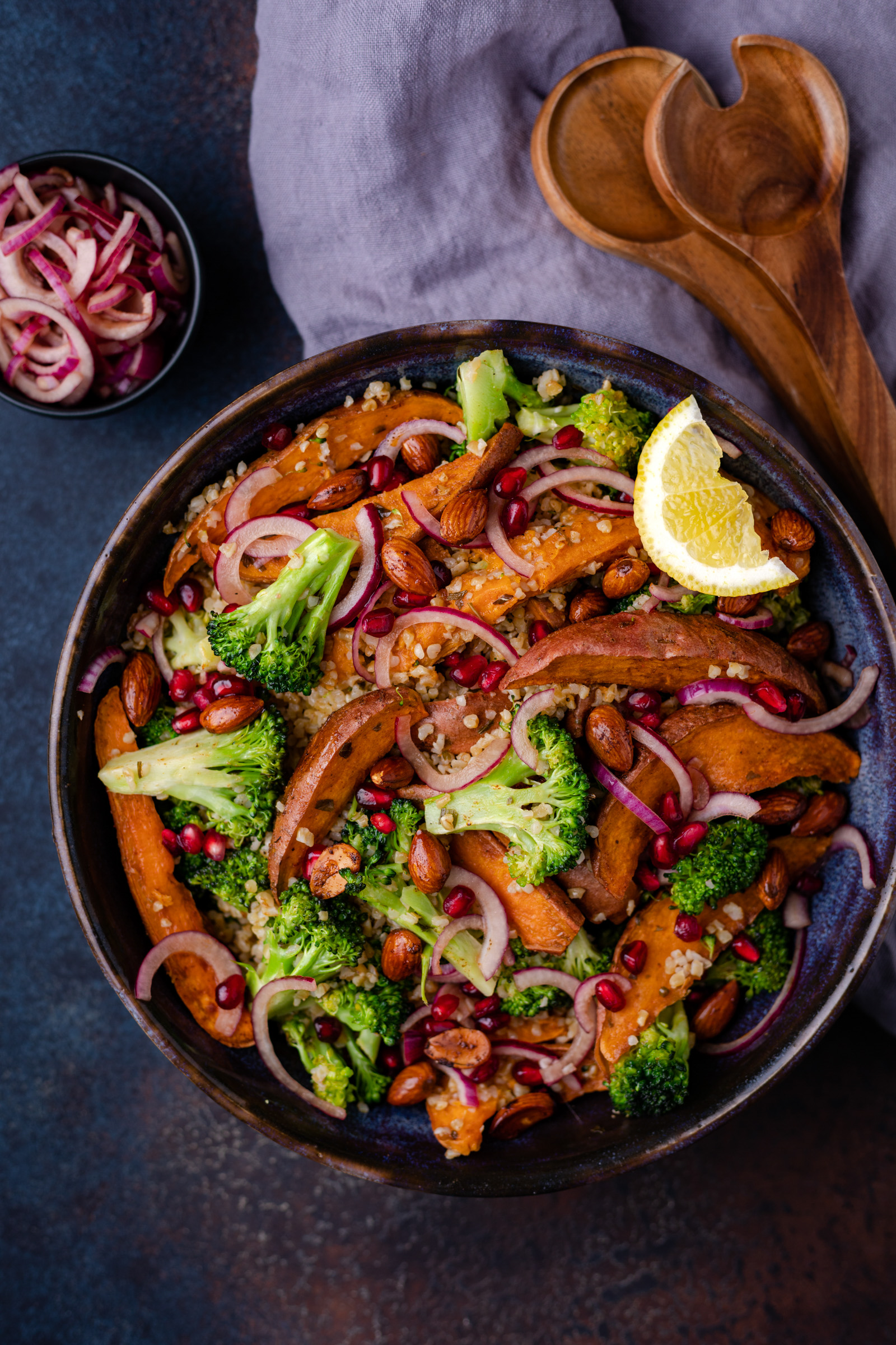 zoete aardappelsalade met broccoli bulgur en granaatappel 2