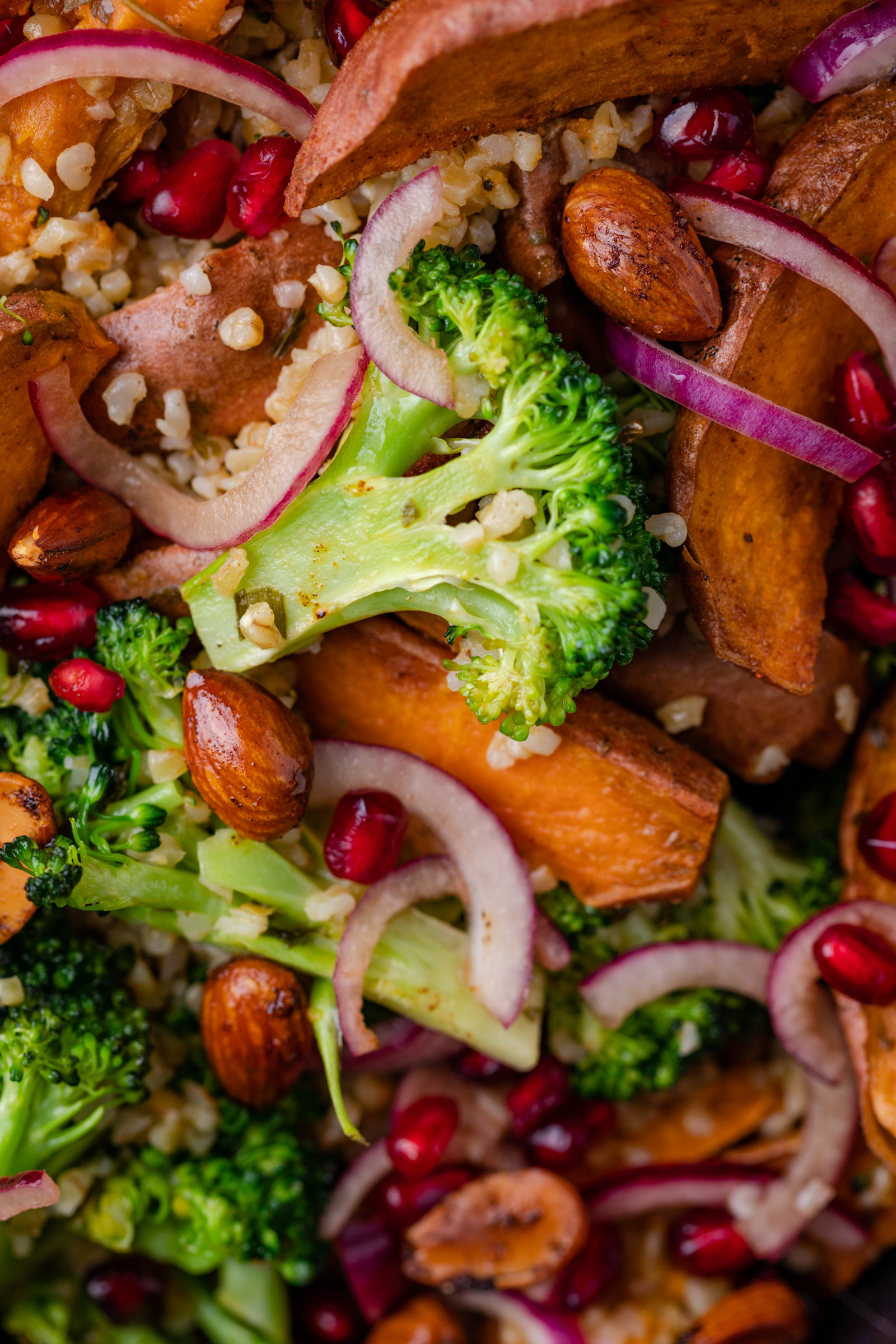 zoete aardappelsalade met broccoli bulgur en granaatappel 4