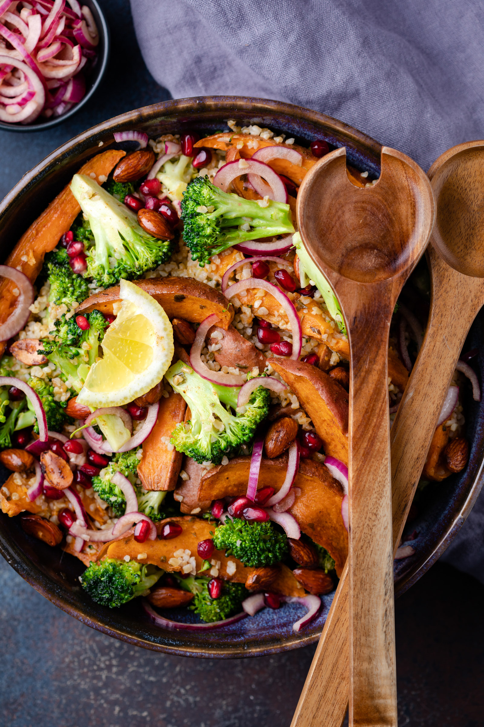 Zoete aardappelsalade met broccoli, bulgur en granaatappel