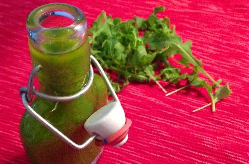 In de tussentijd maak je de kruidenolie. Doe de rucola, basilicum en 100ml olijfolie in een hoge beker en pureer dit helemaal fijn met een staafmixer. Als de olie nog te dik is daarna, dan voeg je nog wat extra olijfolie toe.