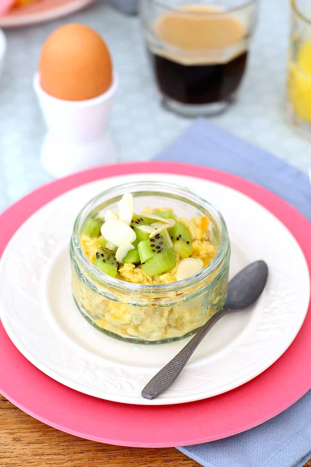 Variatietip: ook erg lekker met wat fijngeraspte sinaasappelschil die je door de zoete scrambled eggs roert met de blokjes mango.