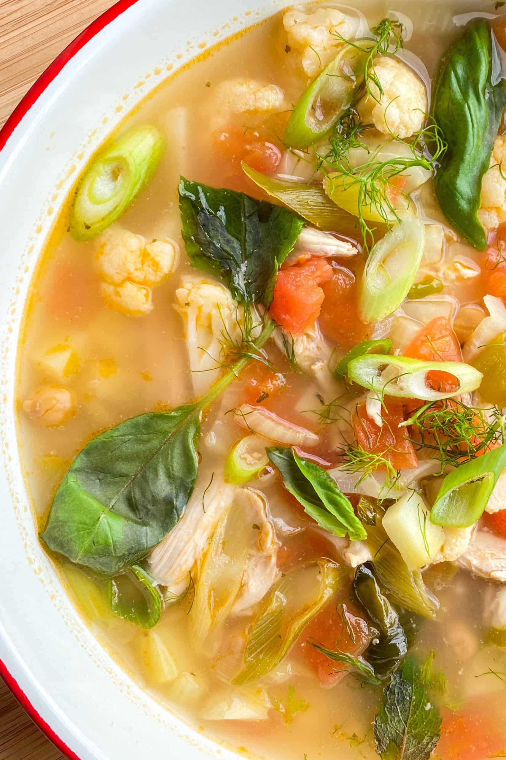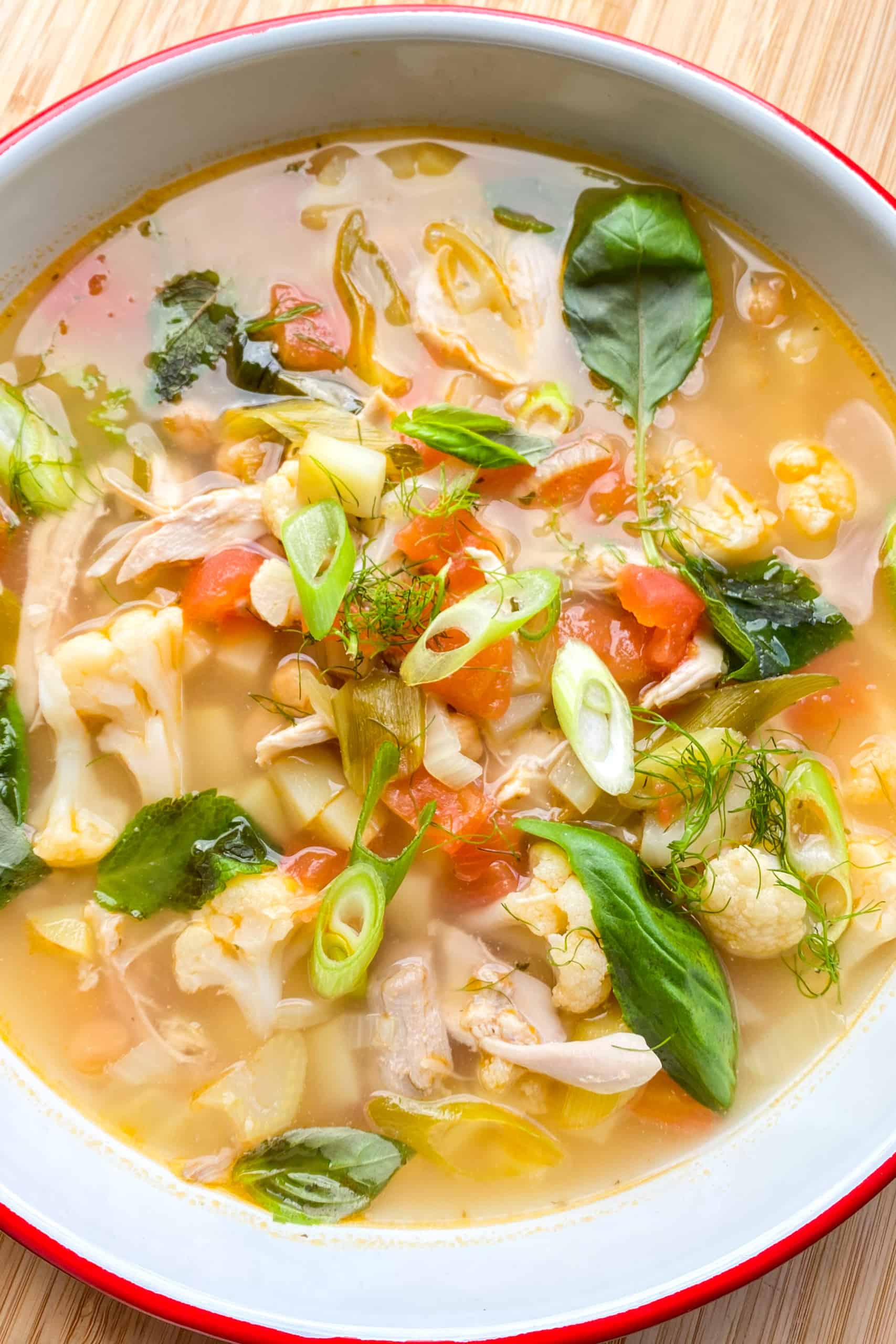 Het werd een geweldig experiment, vooral toen ik besloot om een enorme scheut rode wijnazijn in de pan te schenken, nadat ik de groenten had aangebakken. Dat liet ik inkoken en mengde ik weer met de getrokken bouillon. Dat gaf precies de frisheid die ik zocht voor deze zomerse kippensoep. Naast tomaat en venkel voegde ik ook nog bloemkool en lente-ui toe. En om het af te maken gingen er zelfs nog kikkererwten en verse basilicum en munt door. Wat een plaatje, deze soep. Ook qua smaak.