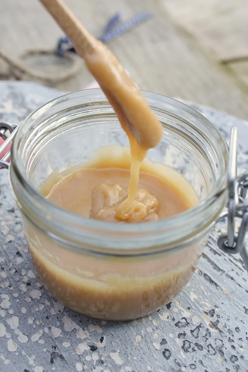Neem de pan daarna van het vuur, laat even een paar minuten afkoelen en schenk de karamel daarna in een schone pot. Gebruik een hittebestendige spatel om alles uit de pan te schrapen. Je kunt de boterkaramel een aantal maanden bewaren in de koelkast. Warm de gewenste hoeveelheid karamel voor gebruik even op en voeg eventueel een beetje water toe om iets te verdunnen.