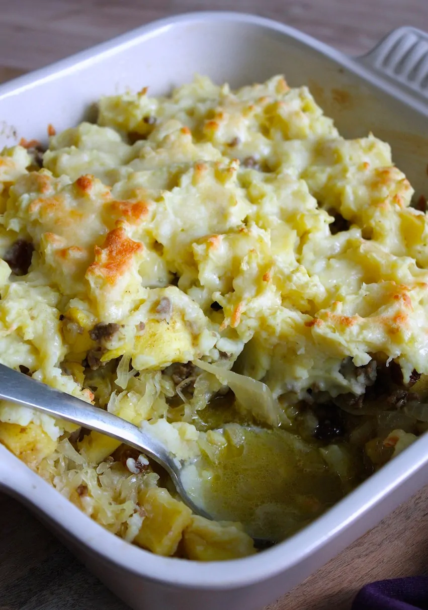 Een heerlijke variatie op zuurkool met gehakt. Combineer met kerrie en ananas en gratineer deze ook nog even in de oven.