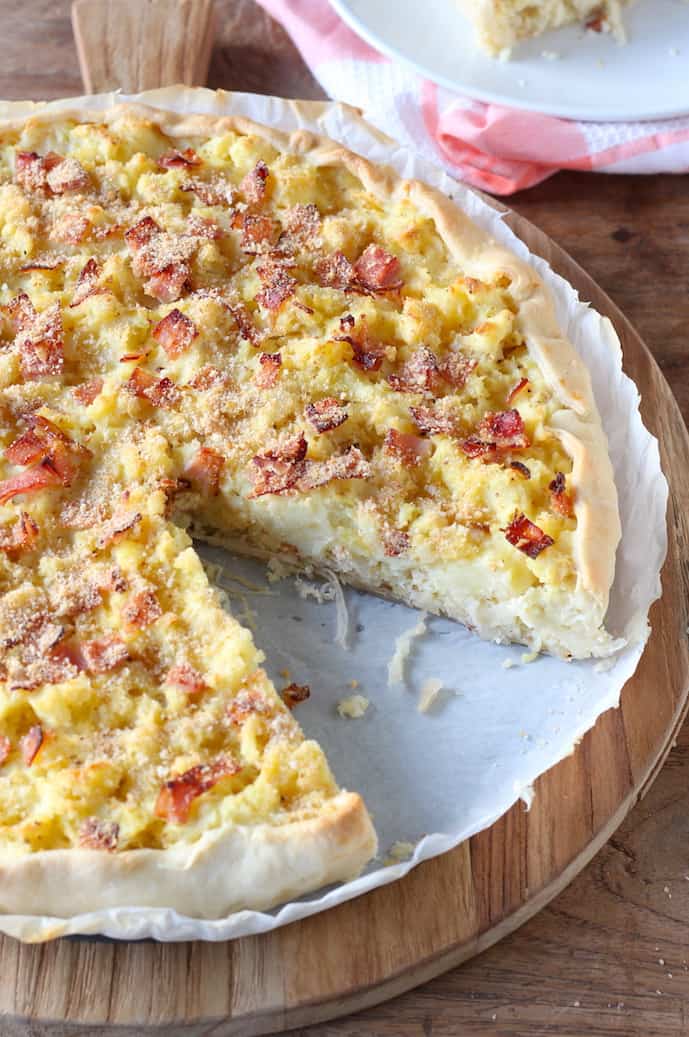 5. Bekleed de quichevorm met het deeg. Prik gaatjes in de bodem met een vork en bestrooi met een laag paneermeel. Leg hierop de zuurkool, het paneermeel zorgt ervoor dat eventueel overtollig vocht uit de zuurkool wordt opgenomen. Maar je hebt daarvoor natuurlijk al wel heel goed het vocht eruit geknepen 😉 Hierover verdeel je het aardappelmengsel en je eindigt met de stukjes beenham.