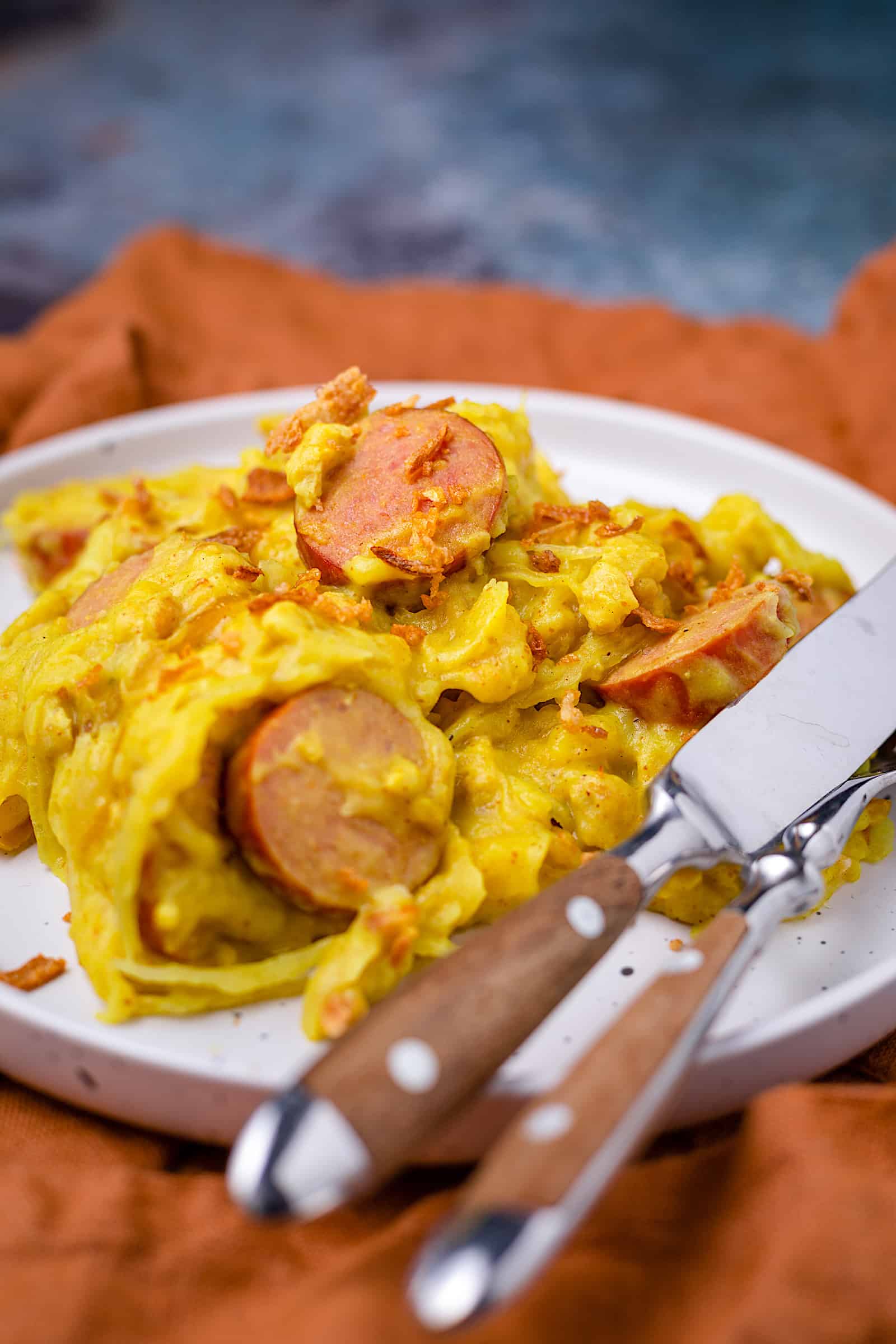 - Roer daarna de zuurkool, rookworst, kipgehakt en gekarameliseerde masala uien erdoor en warm goed door. Eerst even proeven en als je nog meer uien erdoor wilt: doen! Proef ook goed of je nog meer zout of zwarte peper nodig hebt, breng naar eigen wens verder op smaak.